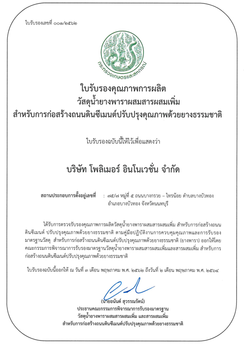 บริษัท โพลิเมอร์ อินโนเวชั่น จำกัด เราเป็นผู้ผลิตน้ำยางพารา ผสมสารผสมเพิ่ม NR Preblend โดยที่ได้รับอนุสิทธิบัตรจากการยางแห่งประเทศไทยและได้รับรองมาตรฐานทางวิศวกรรมของกรมทางหลวง ภายใต้ชื่อการค้า HydroPara® NR Preblend รายชื่อบริษัทฯ ที่ผ่านรับรองมาตรฐานวัสดุผลิตภัณฑ์น้ำยางพาราผสมสารผสมเพิ่ม NR Preblend